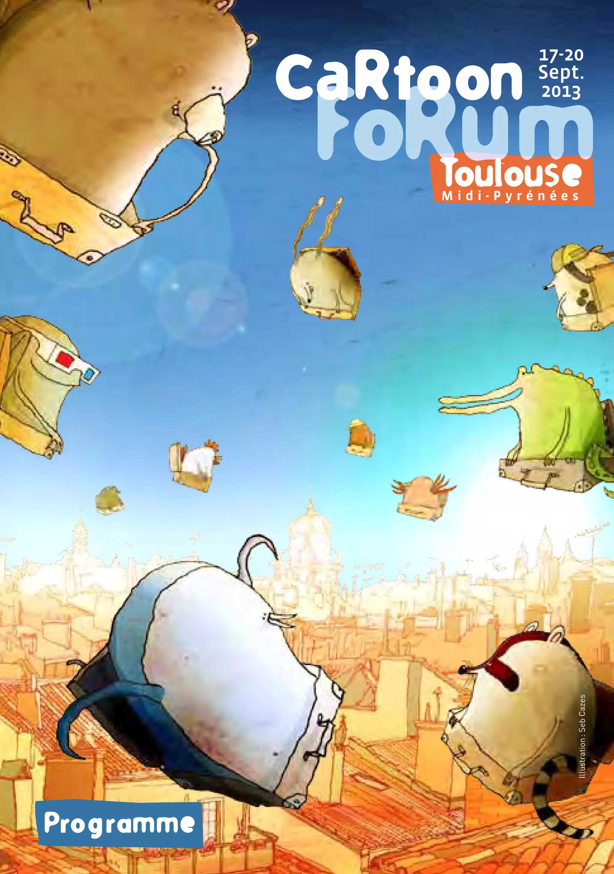 This document provides a program schedule for the Cartoon Forum 2013 event taking place from September 17-20 in Toulouse, Midi-Pyrénées, France. The schedule lists animated films that will be screened each day, organized by time, title, production company, target audience and contact information. The event will also include cocktail parties, dinners, awards ceremonies and press conferences over the four day period.