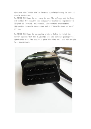 This document provides information about the MKIII All Comms diagnostic tool for Range Rover L322 vehicles from 2003-2005. The tool connects via USB and OBDII port to read and clear fault codes from various vehicle systems like ABS and air suspension. It can also customize settings for air suspension, vehicle entry, and parking sensors. The tool supports ongoing additions to allow communication with more vehicle systems over time. It is meant to help diagnose problems by identifying fault codes but may not resolve physical issues requiring repair.
