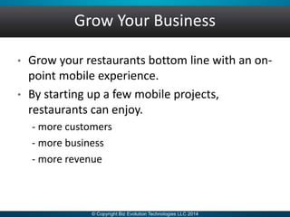 The document emphasizes the importance of mobile experiences for restaurants, highlighting that a majority of consumers prefer mobile-friendly sites and apps. It discusses various mobile solutions like apps, websites, and QR codes that can help restaurants attract more customers and increase revenue. Additionally, it presents statistics on mobile usage and offers insights into how mobile ordering can significantly boost business performance.