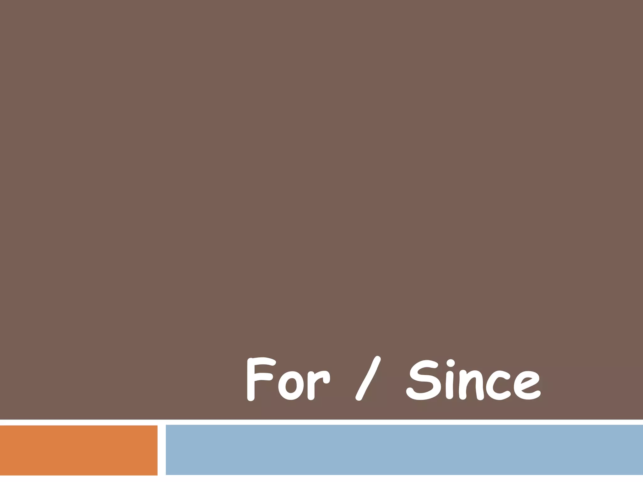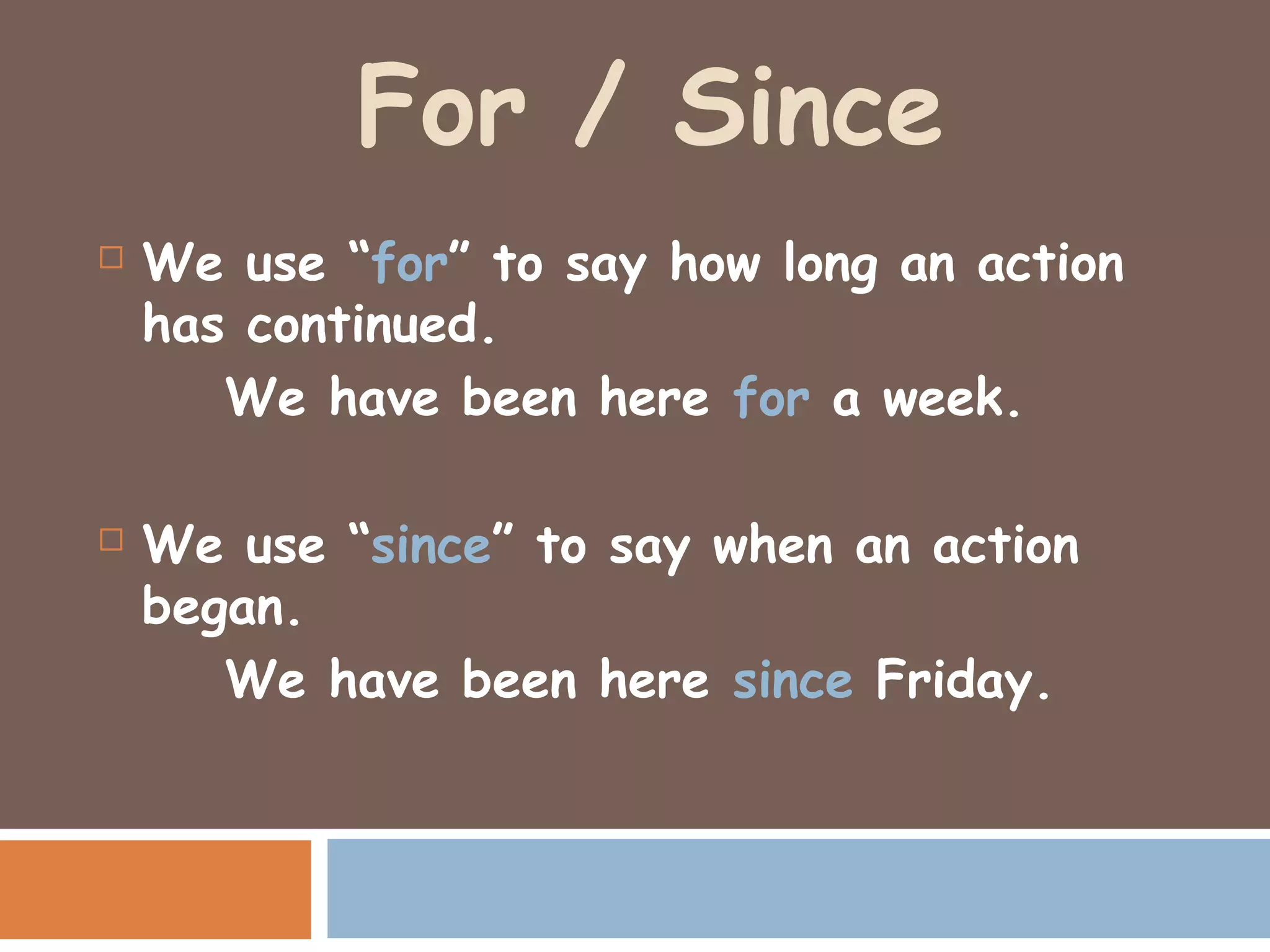 This document provides examples of using "for" and "since" to indicate duration or a starting point of an action. "For" is used to indicate how long an action has continued, such as "We have been here for a week." "Since" is used to indicate when an action began, such as "We have been here since Friday." The document gives multiple pairs of examples contrasting the proper uses of "for" and "since."