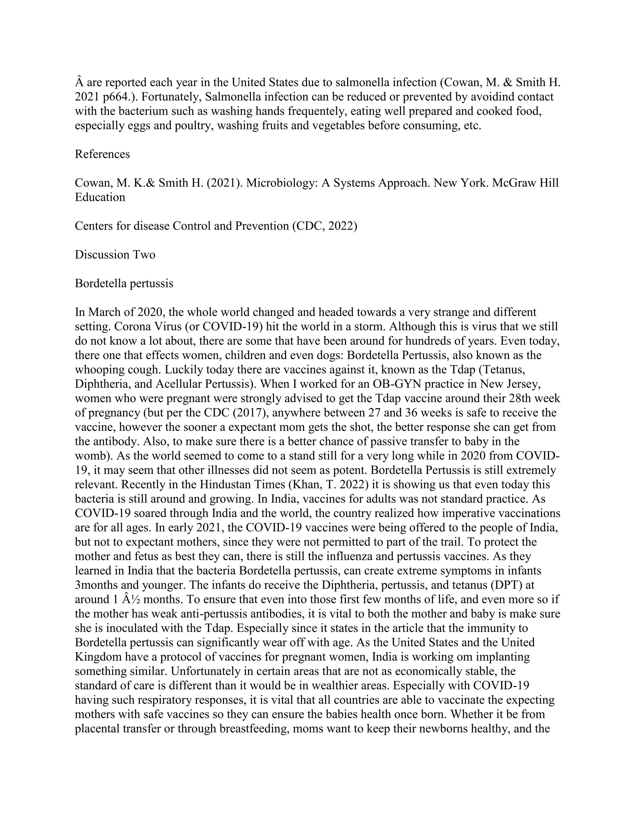 The document discusses two significant bacterial infections: Salmonella enteritidis and Bordetella pertussis. It highlights the transmission, symptoms, and prevention of salmonella, emphasizing its commonality in foodborne illnesses, and the importance of Tdap vaccination during pregnancy to protect infants from whooping cough. The text also addresses global vaccine practices and the need for increased awareness and accessibility, particularly in regions with fewer resources.
