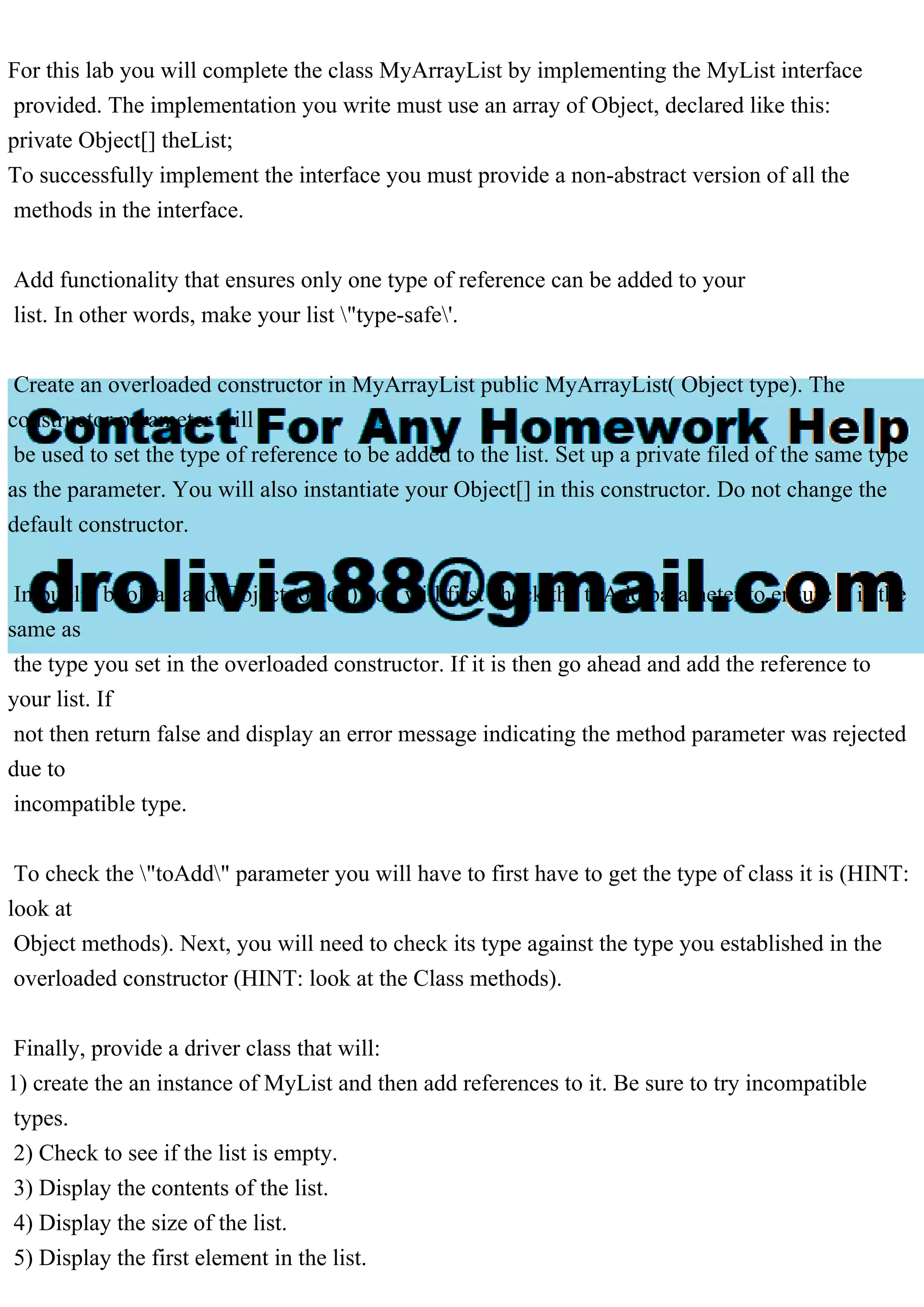 The document provides instructions for implementing a class `myarraylist` that adheres to the `mylist` interface using an array of objects. It emphasizes type safety by requiring only one data type for the list elements, which is enforced through a constructor and an `add` method. Additionally, it outlines the implementation of various list operations and includes a driver class with examples of adding, checking, and removing elements from the list.