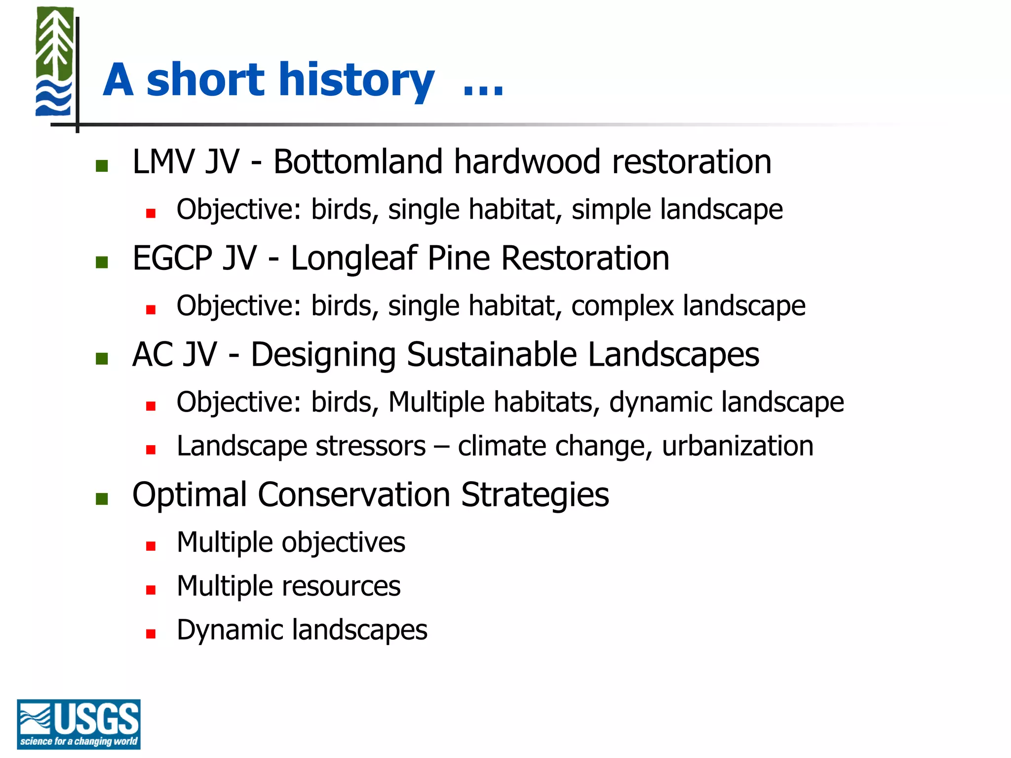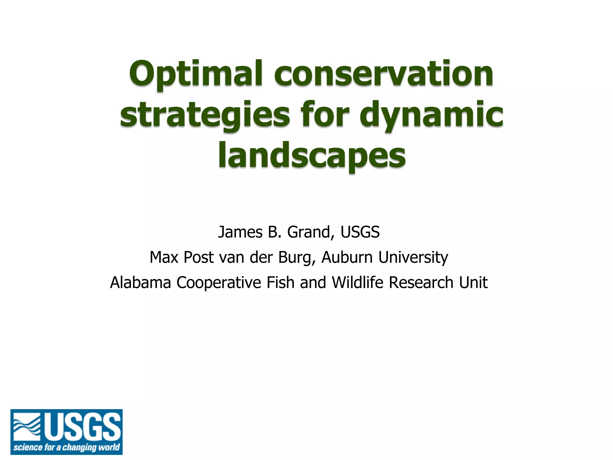 This document discusses developing optimal conservation strategies for dynamic landscapes in the Southeast US. It outlines a project to 1) assess climate change impacts on habitats and species, 2) predict how management can affect focal species, 3) determine optimal conservation strategies, locations and timings, and 4) identify monitoring needs. Stakeholder input will help define objectives. Expert opinion, research and models will predict strategy consequences. Working groups will develop decision tools to compare strategies and make recommendations.