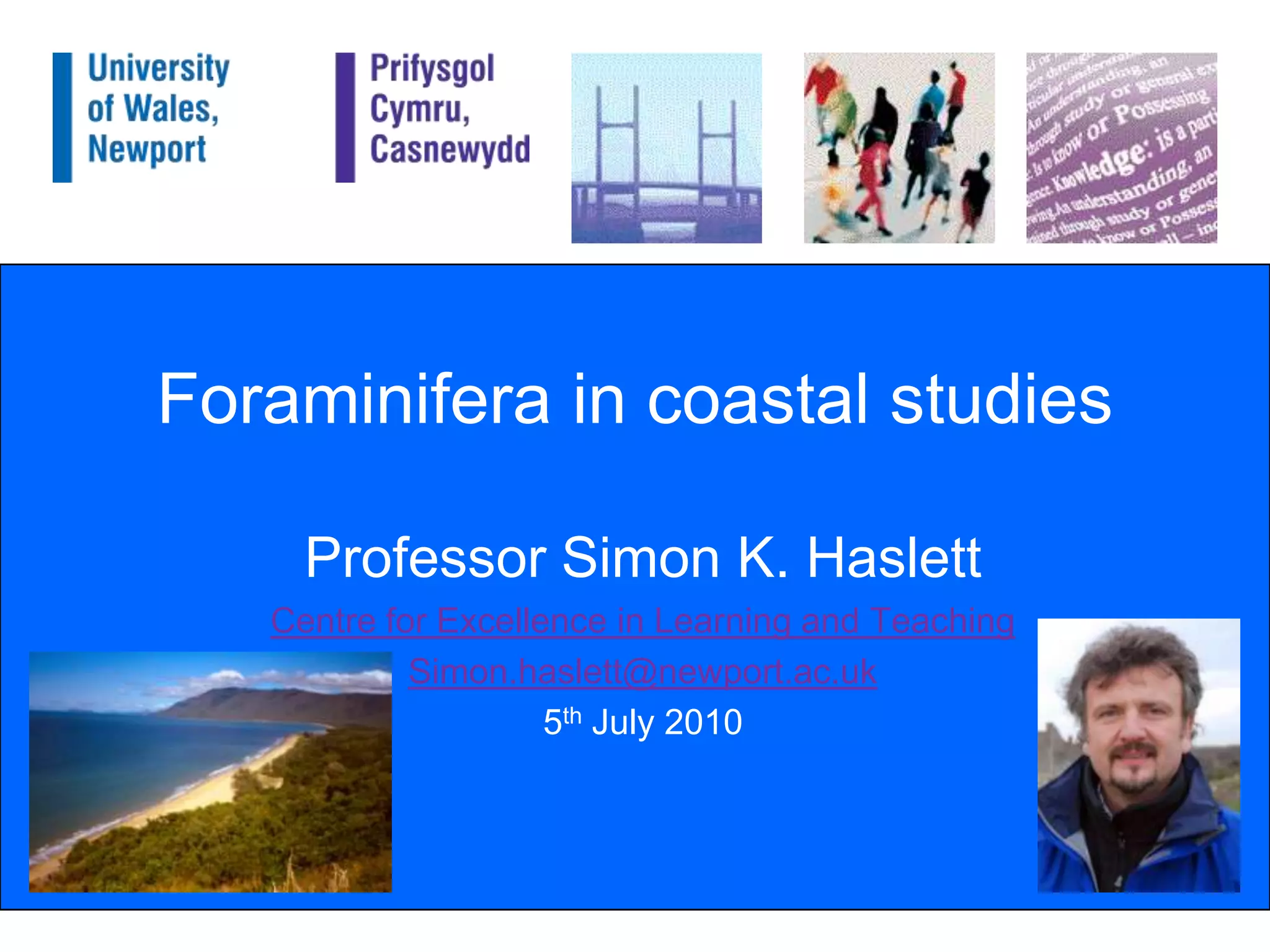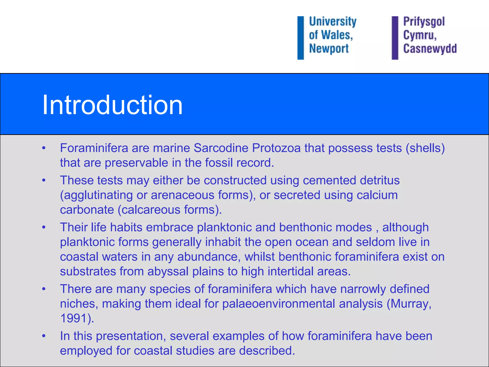 Foraminifera are single-celled organisms that live in marine environments and produce shells or tests. Their tests can be preserved as fossils and used to reconstruct past environments. Foraminifera inhabit different zones within salt marshes and mangroves based on tidal levels, making them useful indicators for paleoenvironmental studies. Studies of foraminifera distribution in the Severn Estuary, UK showed distinct zones related to tide levels that allow reconstruction of past sea levels and salt marsh evolution. Foraminifera also have potential as indicators of coastal pollution and sediment transport.