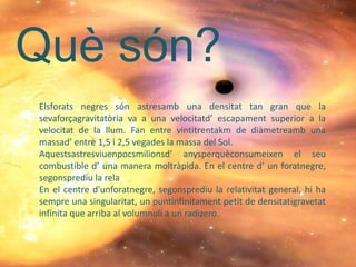 Què són?Elsforats negressón astresamb una densitat tan gran que la sevaforçagravitatòria va a una velocitatd’ escapament superior a la velocitat de la llum. Fan entre vintitrentakm de diàmetreamb una massad’ entre 1,5 i 2,5 vegades la massa del Sol. Aquestsastresviuenpocsmilionsd’ anysperquèconsumeixen el seu combustible d’ una manera moltràpida. En el centre d’ un foratnegre, segonsprediu la relaEn el centre d'unforatnegre, segonsprediu la relativitat general, hi ha sempre una singularitat, un puntinfinitament petit de densitatigravetat infinita que arriba al volumnuli a un radizero.