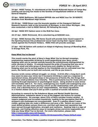 The document discusses the 2012 Reserve Sailor of the Year (RSOY) competition, highlighting the achievements of outstanding Navy Reservists and culminating in the selection of AWS1 Brian Denike as the award recipient. It also details various community involvement activities by Navy Operational Support Centers (NOSC) across the country from April 14-26, 2013, emphasizing service and awareness events, including child abuse prevention and environmental cleanups. Additionally, it introduces the 'Keep What You’ve Earned' campaign focusing on responsible drinking to safeguard Navy careers and mental health.