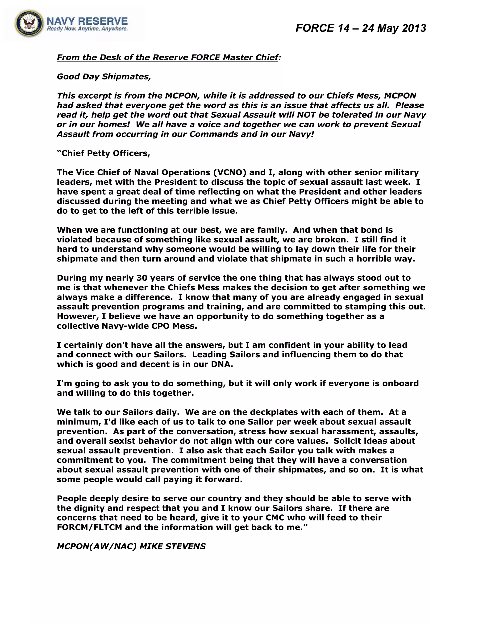 The MCPON asks Chief Petty Officers to help prevent sexual assault in the Navy by talking to at least one sailor per week about prevention. He wants each sailor to then commit to discussing prevention with one of their shipmates, to spread the message throughout the fleet. The excerpt is included to get the word out that sexual assault will not be tolerated. It asks everyone to work together to stamp out this issue.