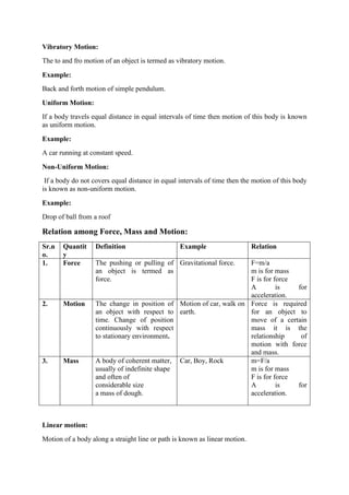 Force and motion are defined. Force is a push or pull that acts on an object, while motion is a change in an object's position over time. There are different types of motion including translation, rotation, and vibration. Force, mass, and motion are related by Newton's laws. Newton's three laws of motion are outlined, including the laws of inertia, acceleration proportional to force, and every action having an equal and opposite reaction.