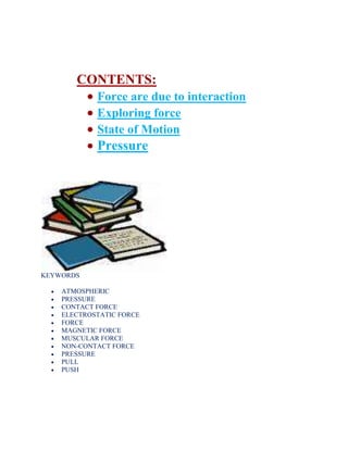 This document provides self-learning material on forces and pressure. It contains definitions of key terms like force, pressure, contact forces, non-contact forces. It describes how forces can cause objects to move, change speed or direction of motion. Experiments are presented to demonstrate that forces can also change the shape of objects. Specific forces like muscular force, magnetic force, electrostatic force, atmospheric pressure are discussed. Diagrams and activities help explain these concepts.