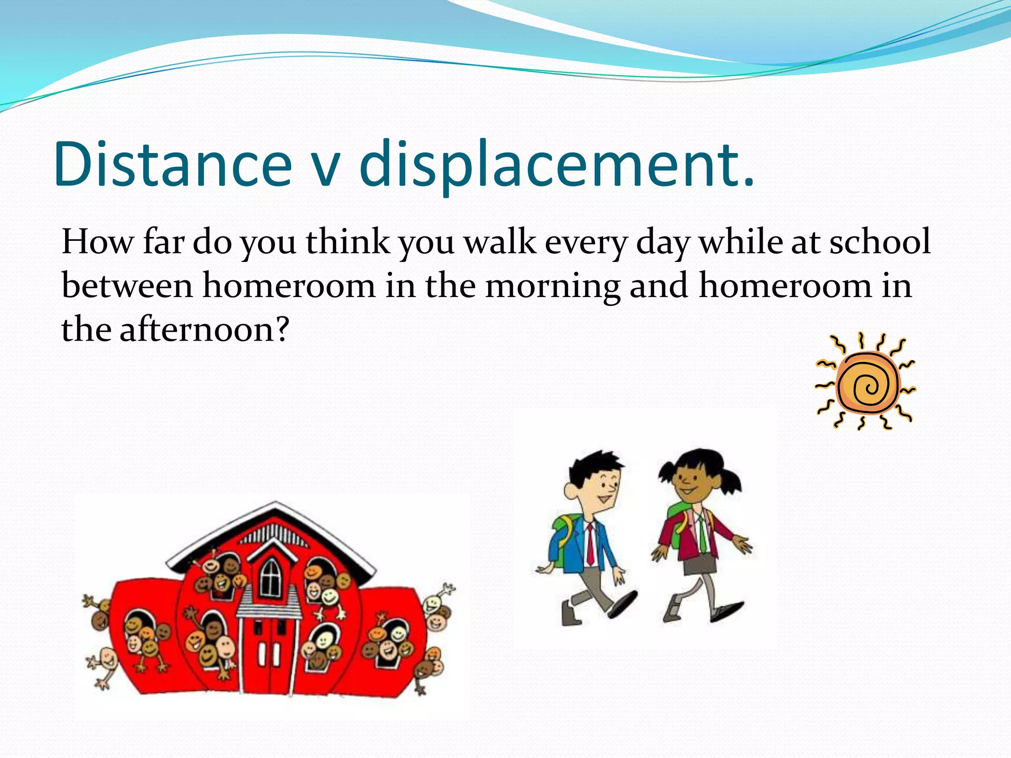 This document defines and distinguishes between distance, displacement, and position-time graphs. It explains that distance is a scalar quantity that measures how far an object travels, while displacement is a vector quantity that measures the net change in position including direction. Position-time graphs can be used to determine an object's displacement and speed over time by plotting its position. The document provides examples comparing distance and displacement using a treasure hunt scenario and position-time graphs. Definitions and examples are included to illustrate these core physics concepts.