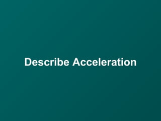- Acceleration is a change in an object's velocity, which can be a change in speed or direction. Deceleration is negative acceleration as an object slows down.