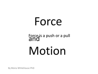 This document provides an overview of forces and motion. It discusses the four fundamental forces - strong nuclear, weak nuclear, electromagnetic, and gravitational. It explains how static electricity is caused by an imbalance of electrons on objects. Experiments are described to demonstrate the attraction and repulsion of charged objects. The document also covers electromagnetism, generators, motors, gravity, and Newton's laws of motion. Key concepts include like charges repelling and opposite charges attracting, and that in a vacuum all objects fall at the same rate regardless of mass.