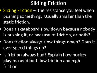 Static friction opposes motion when two surfaces contact each other without movement. Sliding friction is smaller than static friction and resists the motion of surfaces sliding against each other. Elastic forces, such as tension and compression, act on objects when they are stretched or squeezed from their regular shape, pushing back into their original form. The normal force is the supporting force exerted by a stable surface on an object in contact with it, such as a table pushing back on a book resting upon it.
