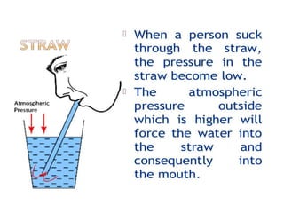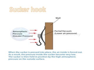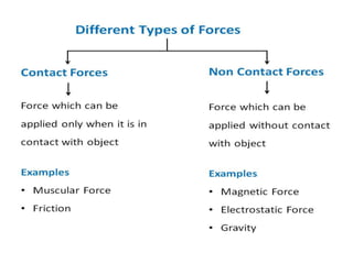 Force is a push or pull that can cause an object to be in motion or at rest by overcoming inertia. Forces act due to an interaction between two objects. The net force on an object is the sum of all forces acting on it and depends on both the magnitude and direction of individual forces. Pressure is the amount of force applied per unit area. Liquids and gases exert pressure due to the weight of the fluid above. Atmospheric pressure decreases with increasing altitude and temperature and decreasing humidity.