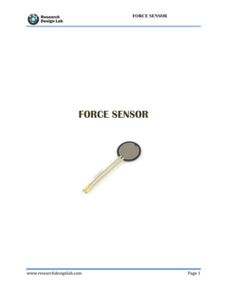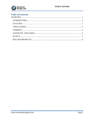 The document describes a force sensitive resistor (FSR) that changes its resistance based on applied pressure, with a sensing range of 100g-10kg and operational features including size and temperature tolerance. It outlines applications in the pharmaceutical and automotive industries, along with working principles and suggestions for improving measurement repeatability. Additional resources include schematics and code for various platforms like Arduino and Atmel.