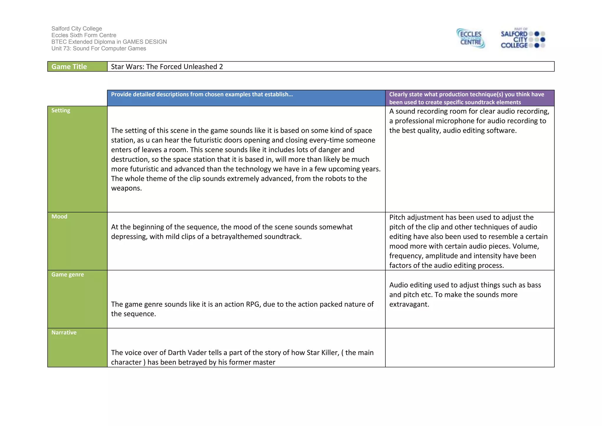 The document summarizes the sound design of a scene from the game Star Wars: The Force Unleashed 2. It describes the setting as a futuristic space station with dangerous destruction. The mood at the beginning is somewhat depressing with a betrayal-themed soundtrack. Production techniques used to create the soundtrack included sound recording in a studio with professional microphones and audio editing software to adjust pitch, volume, frequency, amplitude, and intensity. The game genre is described as an action RPG due to its action-packed nature. The narrative is part of the story where the main character is betrayed by his former master, as told through a voice over of Darth Vader.