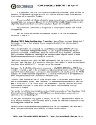 3) Reminders that Sailors are responsible for ensuring their physical fitness records are accurate and up-to-date in the PRIMS system, as these will now be checked as part of the promotion process.