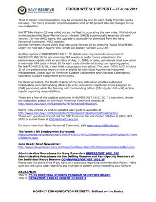 The document is the weekly report from the 14th Navy Reserve Force Master Chief dated 27 June 2011. It provides updates on leadership changes as the new FORCM takes over, highlights policy changes and guidance, and provides operational and readiness statistics for Navy Reserves. It aims to keep Navy Reservists informed of important announcements and events through routine communication.