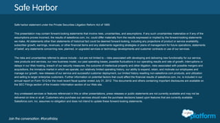The document provides an overview of Salesforce.com and its offerings, highlighting the potential risks associated with forward-looking statements regarding product availability and financial performance. It discusses various automation tools and applications built on the Salesforce platform, promoting engagement and collaboration through social and mobile interactions. Additionally, it encourages new developers to sign up for a free account and learn more about the platform through available resources.