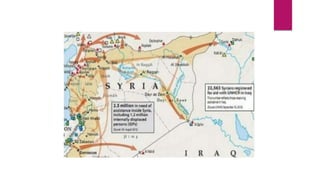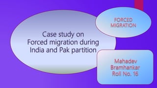 This document discusses forced migration using the examples of Rohingya refugees and Syrian refugees. It defines forced migration as migration caused by conflicts, persecution, disasters or development projects. The Rohingya crisis is discussed, explaining how Rohingya faced discrimination in Burma based on their ethnicity, language and religion, forcing hundreds of thousands to flee to Bangladesh and India. The Syrian refugee crisis is also summarized, outlining how the Syrian civil war since 2011 has displaced millions of Syrians internally and to neighboring countries like Turkey, Lebanon and Jordan. In both cases, refugees face challenges in meeting basic needs and lack of protection in host countries.