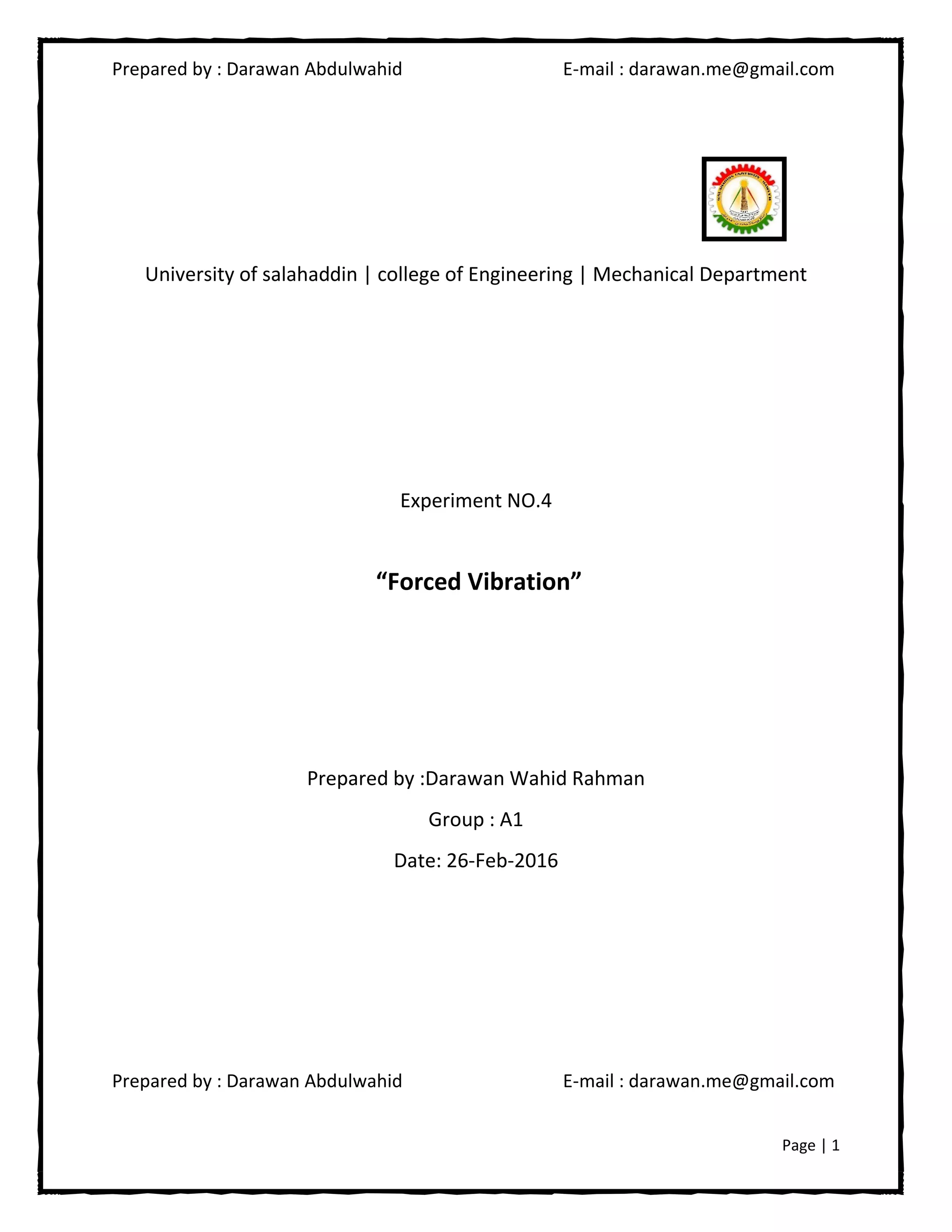 This document describes an experiment on forced vibration. It provides background on forced vibration and details on the experimental procedure and equipment used. The experiment aims to study forced vibration by applying a periodic input from a hand-held exciter to an aluminum beam mounted on a table and measuring the response with an accelerometer and force transducer. Data is acquired using a data acquisition system and analyzed in Pulse Lab Shop software on a PC. The key equipment includes an accelerometer, force transducer, hand-held exciter, data acquisition system and Pulse Lab Shop software.