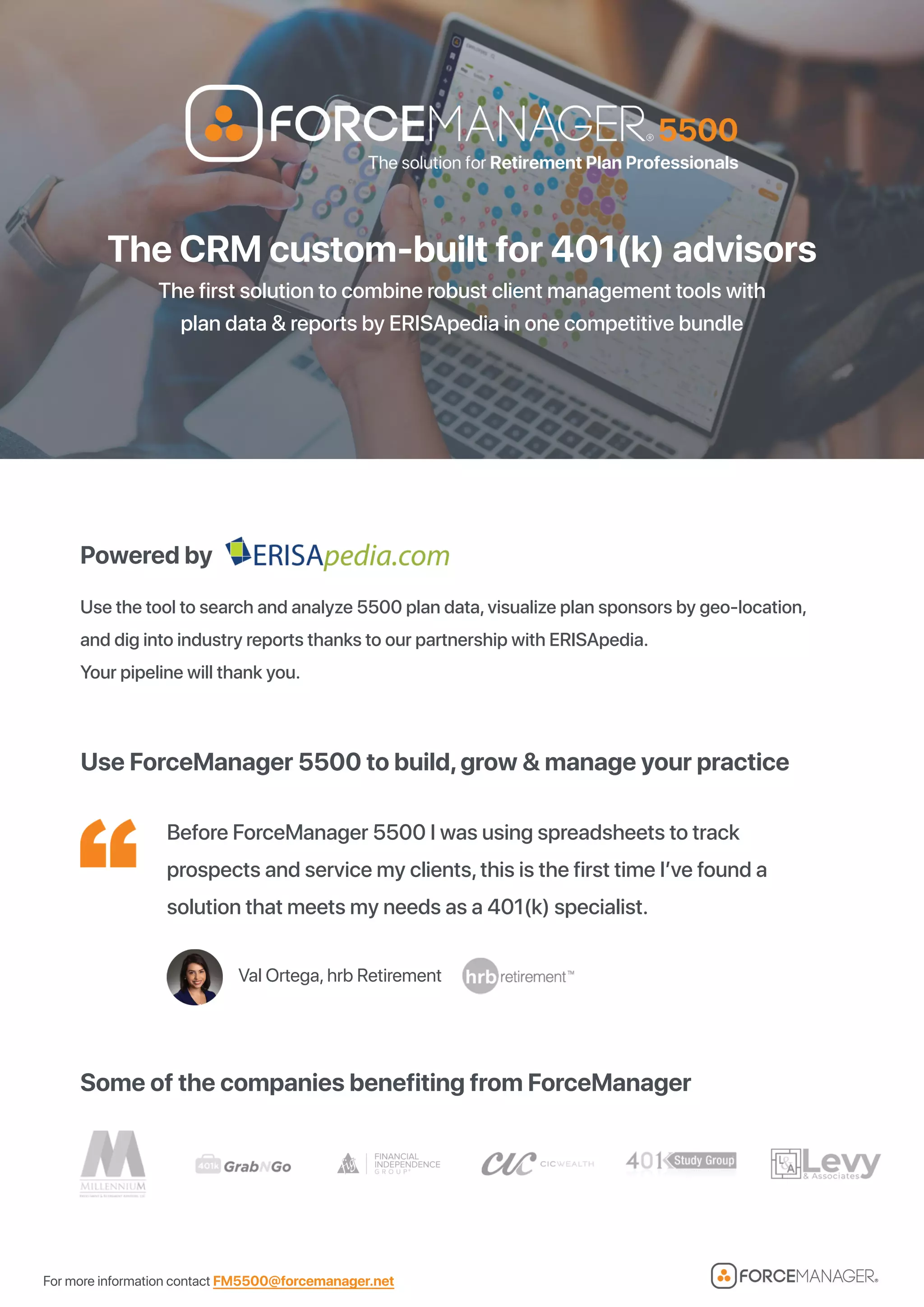 ForceManager is a CRM tool tailored for 401(k) advisors that combines robust client management features with plan data and reports from ERISApedia. It allows users to search and analyze 5500 plan data, build prospect lists using detailed plan information, and includes features like geo-located mapping of plan sponsors, pipeline management, reporting, and an AI voice assistant. ForceManager is offered in Essential, Premium, and Enterprise pricing tiers and claims to help users increase sales activity, save time on administrative tasks, and gain more customer insights.