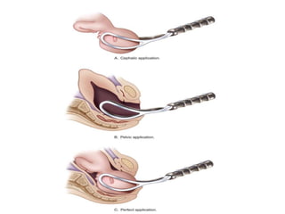 Obstetric forceps are metal instruments used to extract the fetal head during delivery, with various applications based on fetal position and maternal conditions. Indications for use include prolonged labor, maternal distress, and specific fetal conditions, while contraindications include prematurity and unengaged heads. Forceps delivery carries risks for both mother and child, including potential lacerations and fetal injuries, necessitating proper prerequisites such as anesthesia and engaged fetal head.