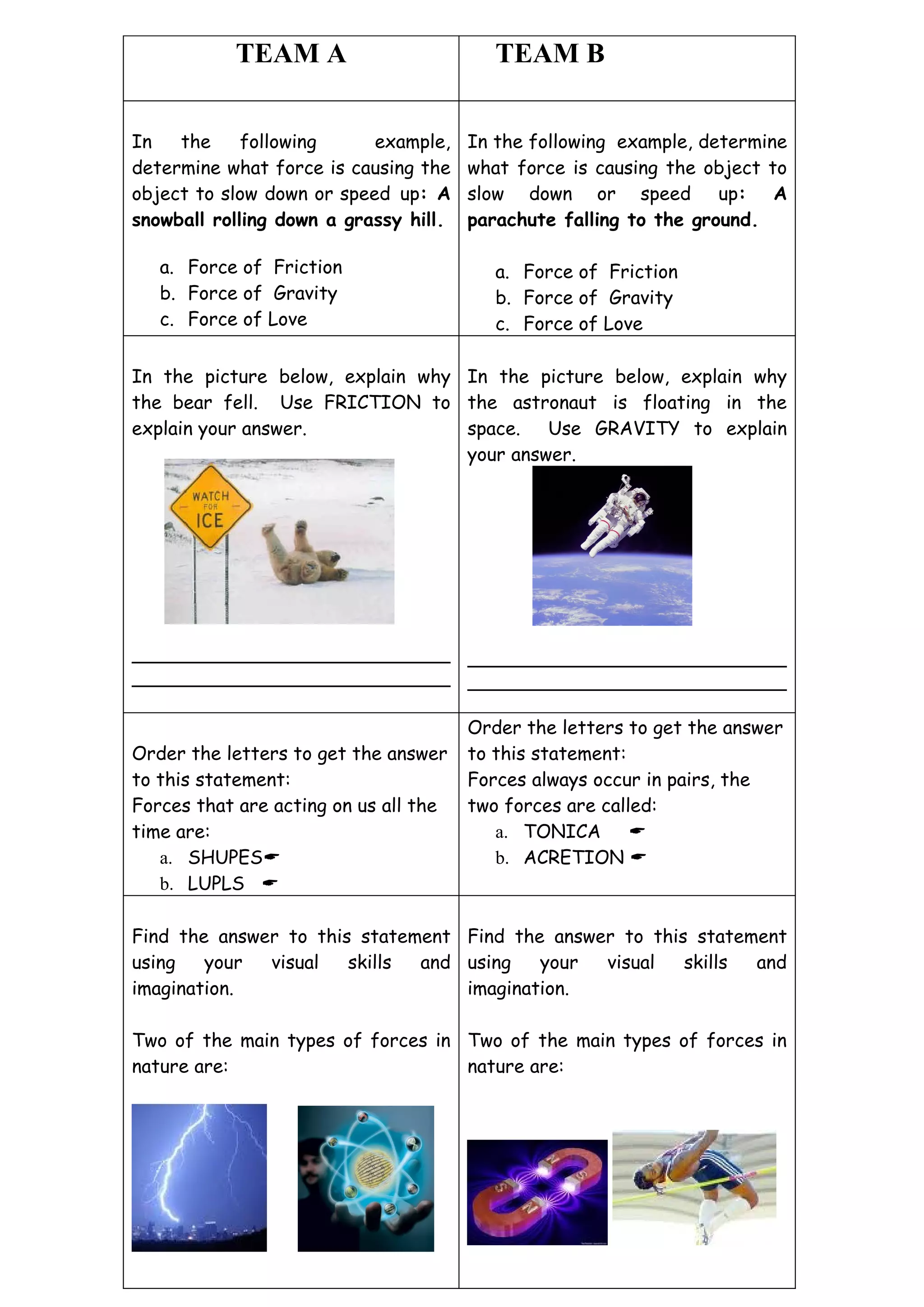 This document contains two similar worksheets about forces and simple machines. Worksheet 1 asks about forces causing objects to speed up or slow down, like friction on a snowball or gravity on a parachute. It also asks about friction causing a bear to fall. Worksheet 2 asks similar force-related questions and provides diagrams of simple machines to identify. Both worksheets ask students to unscramble letters to reveal force terms and define vocabulary.