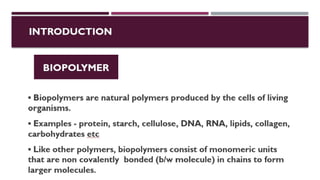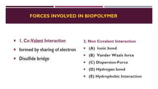 The document discusses biopolymer interactions, detailing various binding processes in biological cells, including covalent and non-covalent bonds. Key forces such as electrostatic, hydrophobic, van der Waals, and hydrogen bonding are examined, illustrating their importance in structures like DNA and proteins. Additionally, it highlights a new technology for encapsulating hydrophobic products using biopolymer bodies in E. coli.
