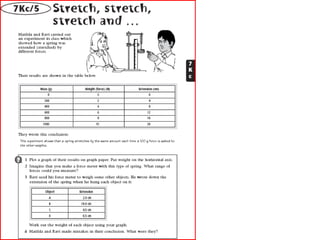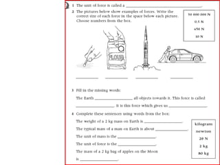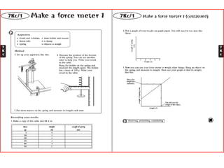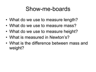 A force meter measures force in Newtons. It works by using a rubber band of known length that stretches when a force is applied. The amount the rubber band stretches corresponds to the amount of force applied, allowing the force to be measured in Newtons on a scale.