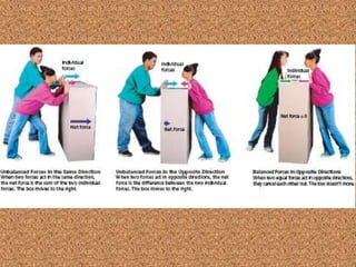 A force is defined as a push or pull exerted by one object on another, characterized by its strength (measured in newtons) and direction. When multiple forces act on an object, the combined effect is the net force, which determines the object's motion, with unbalanced forces causing movement and balanced forces resulting in no change. The document explains how to calculate net forces and describes scenarios involving both unbalanced and balanced forces.