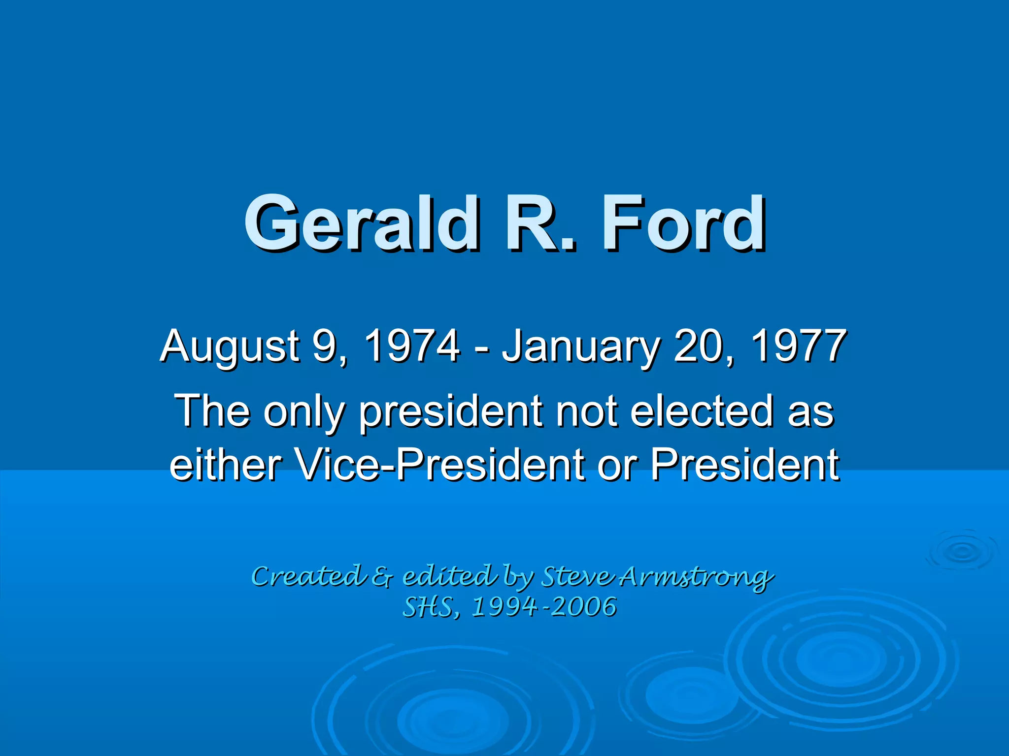 Gerald Ford became president in 1974 after Nixon's resignation. He pardoned Nixon to help the country move on from Watergate, which hurt his approval ratings. Ford faced economic challenges like inflation and energy issues. He met with world leaders and signed the Helsinki Accords. Ford sought reelection in 1976 but lost to Jimmy Carter.