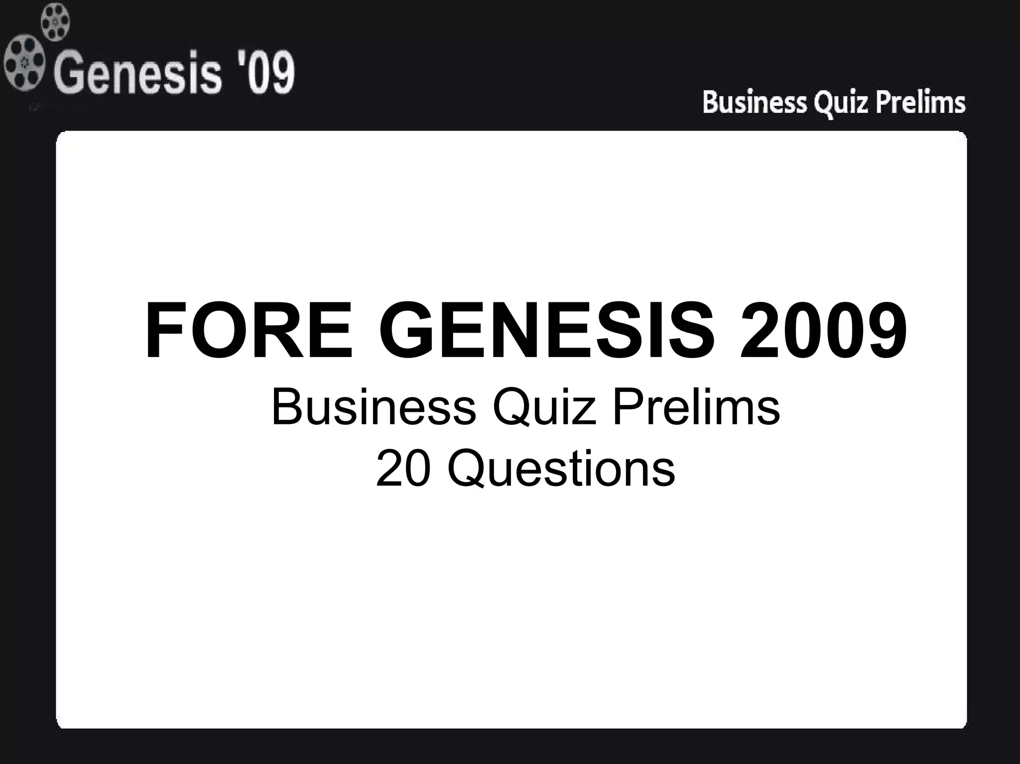 (1) The document provides the rules for a business quiz prelims with 20 multiple choice questions. It notes there are no negative markings and partial points will be awarded for two-part questions. Starred questions from 13-20 will be used as tie-breakers.
