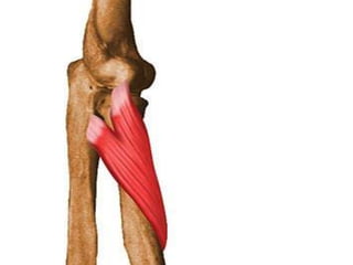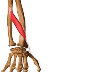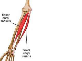 The document describes the muscles of the anterior, lateral, and posterior fascial compartments of the forearm. In the anterior compartment, there are superficial, intermediate, and deep groups of muscles including the flexor carpi radialis, palmaris longus, flexor digitorum superficialis, and flexor digitorum profundus. The muscles are supplied by the median and ulnar nerves except for the flexor carpi ulnaris. The lateral compartment includes the brachioradialis and extensors of the wrist and fingers. The posterior compartment comprises extensors of the wrist, fingers and thumb including the abductor pollicis longus, extensor pollicis brevis and extensor
