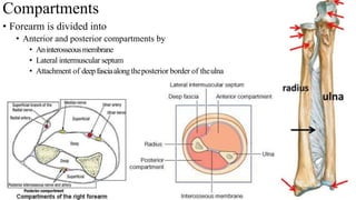 The forearm is divided into anterior and posterior compartments by interosseous membrane and septum. The anterior compartment contains 8 muscles innervated by median nerve except for flexor carpi ulnaris and half of flexor digitorum profundus which are innervated by ulnar nerve. The posterior compartment contains muscles for wrist extension, finger extension and supination, all innervated by radial nerve. The interossei muscles are located between metacarpal bones and control finger abduction/adduction.