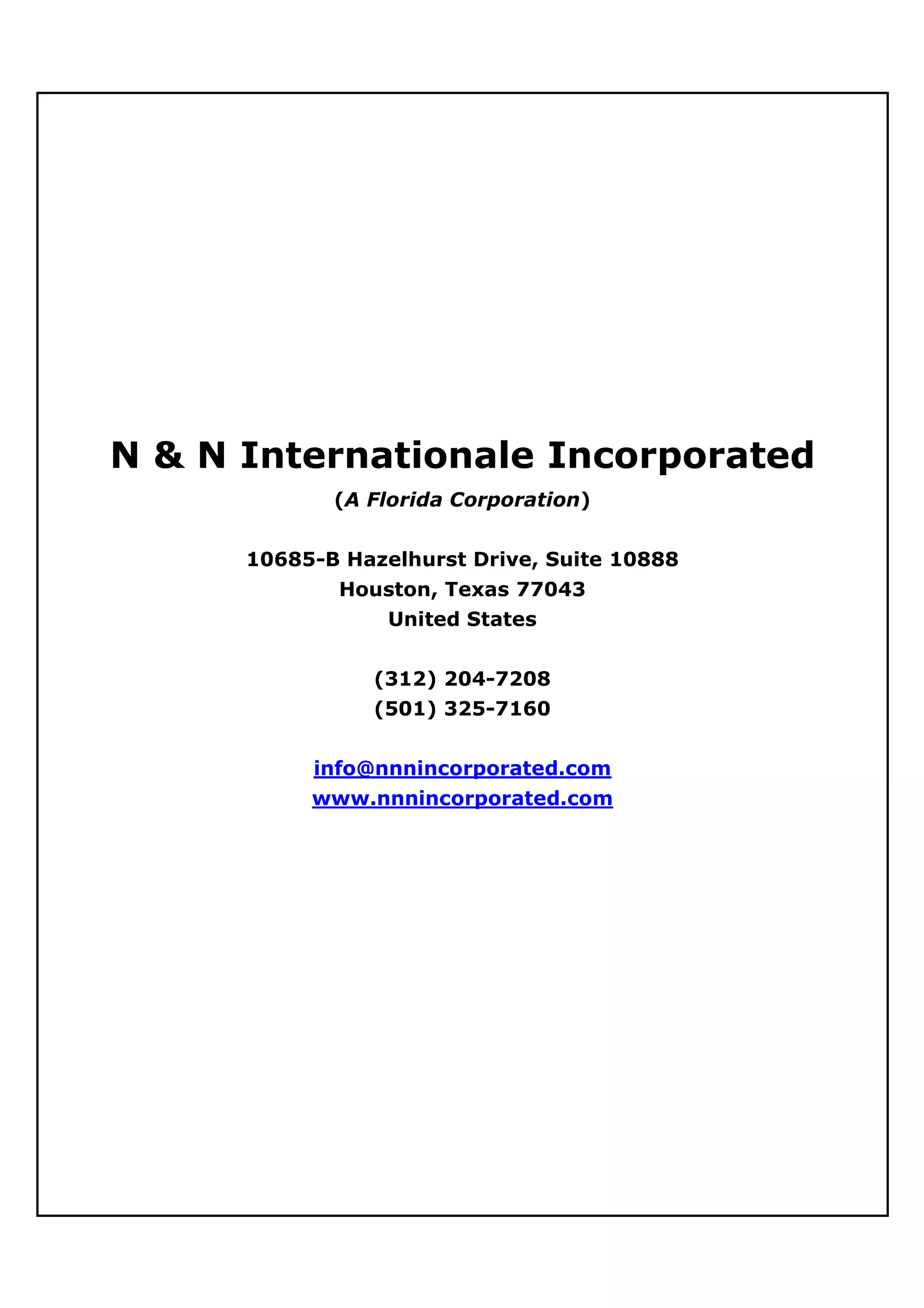 N & N Internationale Incorporated, through its subsidiary Saga Management Solutions Inc., assists US citizens in obtaining cash advances and applying for government grants. Saga contacts people in need and connects them with lenders for payday loans for a $49 fee, or explains the grant application process and available grants for a $69.95 fee. Saga forecasts contacting over 2,000 customers in 2013 and over 5,000 in 2014 for payday loans and government grants, generating projected revenues of over $196,000 in 2013 and over $1 million in 2014.