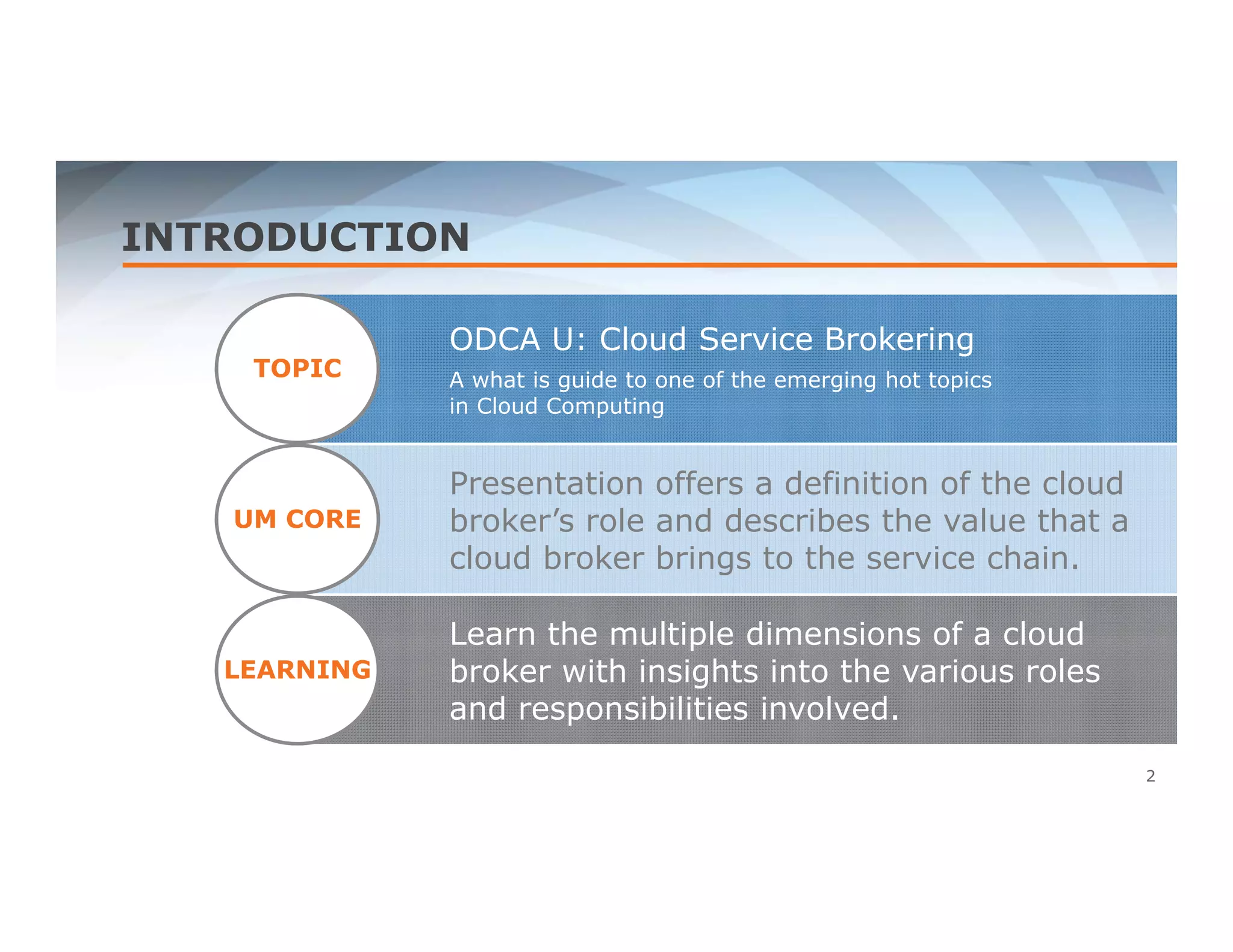 The document provides an overview of cloud service brokering, defining the role and value of cloud brokers in facilitating cloud computing solutions for organizations. It outlines different types of brokerage, service models, best practices, and industry actions recommended for brokers, providers, and consumers. Key takeaways emphasize using cloud brokers to enhance adoption, simplify acquisition, and centralize governance in hybrid cloud environments.