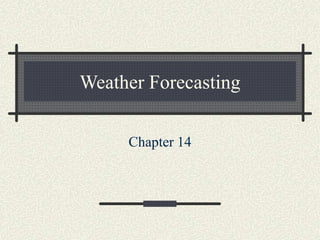 Chapter 14 covers the essential steps in weather forecasting, which include evaluating current conditions, predicting future scenarios via computer models, and interpreting the results. Tools such as AWIPS and Nexrad radar assist forecasters in analyzing data and making predictions based on historical climate records and trends. The chapter also discusses various forecasting methods and the use of surface and upper-level charts to track weather system movements.