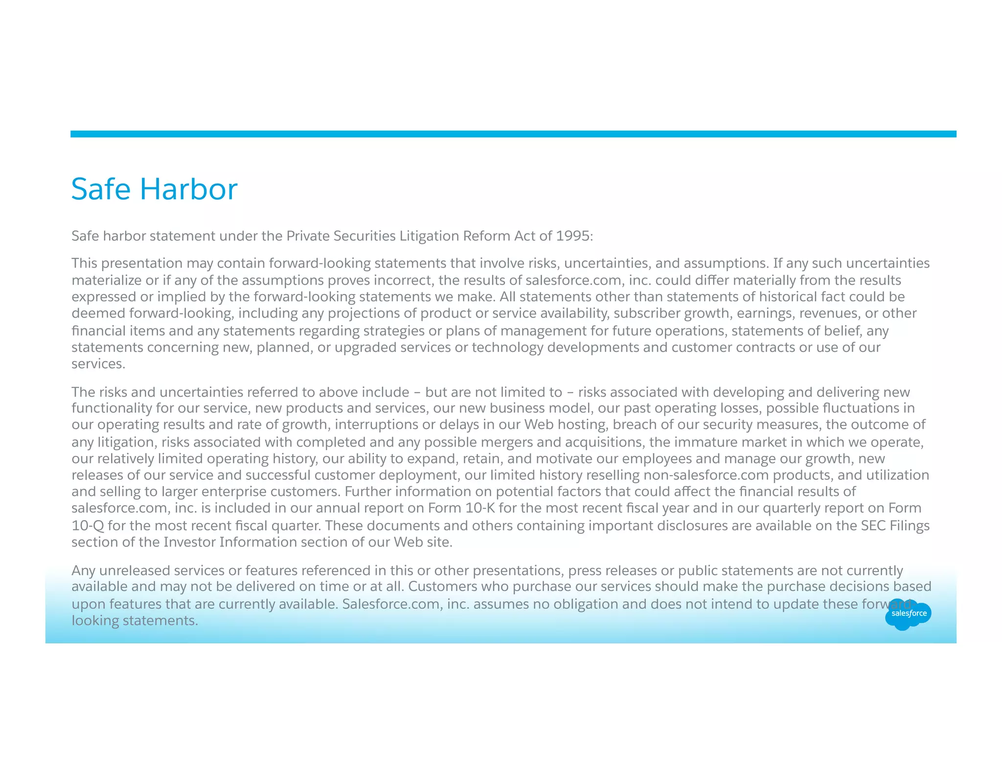The document discusses Salesforce's collaborative forecasting features and the associated benefits, including improved forecast accuracy and real-time visibility into team forecasts. It highlights the importance of understanding risks and uncertainties related to product developments and market conditions, while also presenting issues faced by companies like Nitro in integrating collaborative forecasting with their existing systems. Additionally, it provides examples of how different organizations utilize Salesforce for effective revenue forecasting and quota attainment reporting.