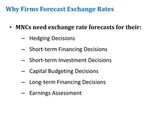 This document discusses why MNCs forecast exchange rates and different techniques for doing so. MNCs need to forecast exchange rates for hedging decisions, short-term financing, investments, capital budgeting, earnings assessments, and long-term financing. Exchange rate forecasts help MNCs determine things like whether to hedge currency risk, which currency to borrow in, and whether to remit foreign subsidiary earnings. There are four main categories of forecasting techniques: technical analysis of historical exchange rate data, fundamental analysis of economic factors affecting exchange rates, market-based analysis using current spot or forward rates, and subjective assessments.