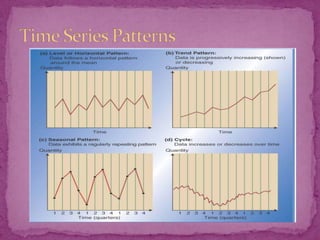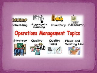This document discusses operations management and forecasting. It explains that operations management deals with designing and managing processes, products, services and supply chains to deliver goods and services customers want. Forecasting helps managers reduce uncertainty by predicting future demand to match supply. The document then discusses various forecasting methods including qualitative judgmental methods and quantitative mathematical modeling methods. It covers short, medium and long-range forecasting as well as different time series and causal modeling techniques.