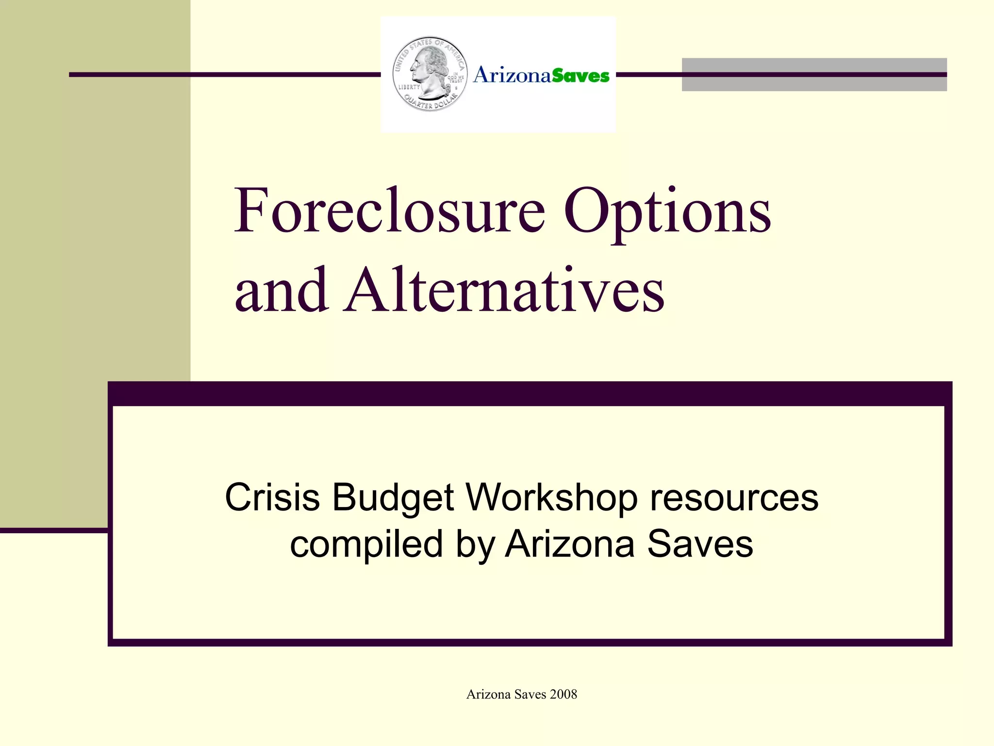 The document provides information on options for homeowners who are facing foreclosure or are at risk of defaulting on their mortgage. It outlines steps homeowners should take if they are behind on payments but not in default, including reducing expenses, liquidating assets, or refinancing. If in default, homeowners should contact their lender's loss mitigation department and provide documentation of their hardship. The document describes options to keep the home such as repayment plans, loan modifications, or partial claims. If unable to keep the home, options include short sales or deeds in lieu of foreclosure. It provides resources for assistance and prevention programs in Arizona.