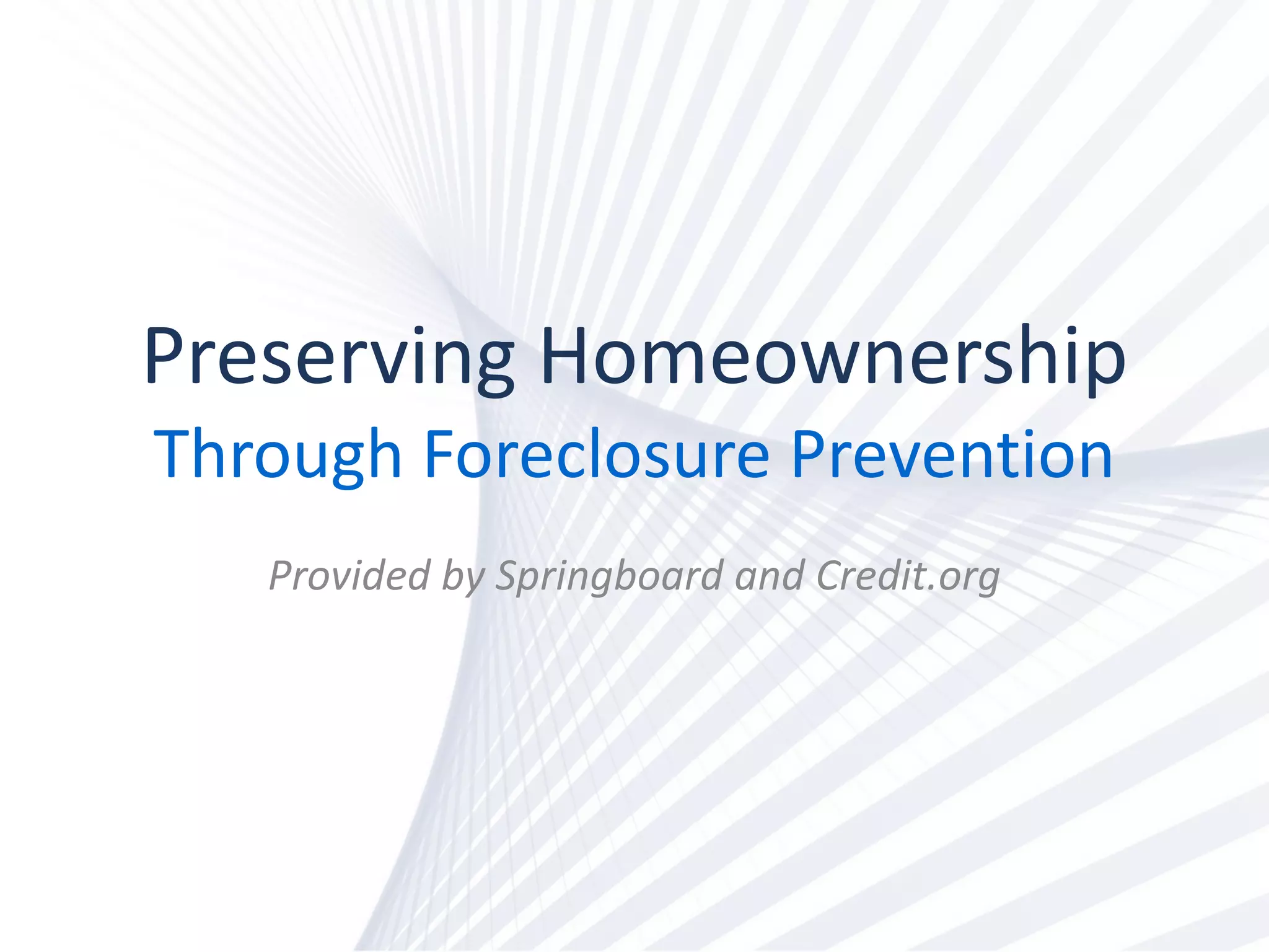 The document outlines foreclosure prevention strategies provided by Springboard and Credit.org, emphasizing the importance of early intervention and counseling for homeowners facing financial difficulties. It includes definitions of key terms related to foreclosure, various options for assistance such as loan modification and special forbearance, and warns against common scams. The document encourages homeowners to seek help promptly to avoid the negative consequences of foreclosure.
