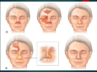 The forehead flap is a versatile flap used for reconstructing various facial defects. It has reliable blood supply from branches of the superficial temporal artery. The flap can be raised in different planes and tunneled to reach intraoral defects. It is commonly used in a two-stage procedure for nasal reconstruction, where the flap is first transferred to the defect and then the pedicle is divided later. Pre-expansion of the donor site can increase the available skin but comes with disadvantages like delaying the repair.