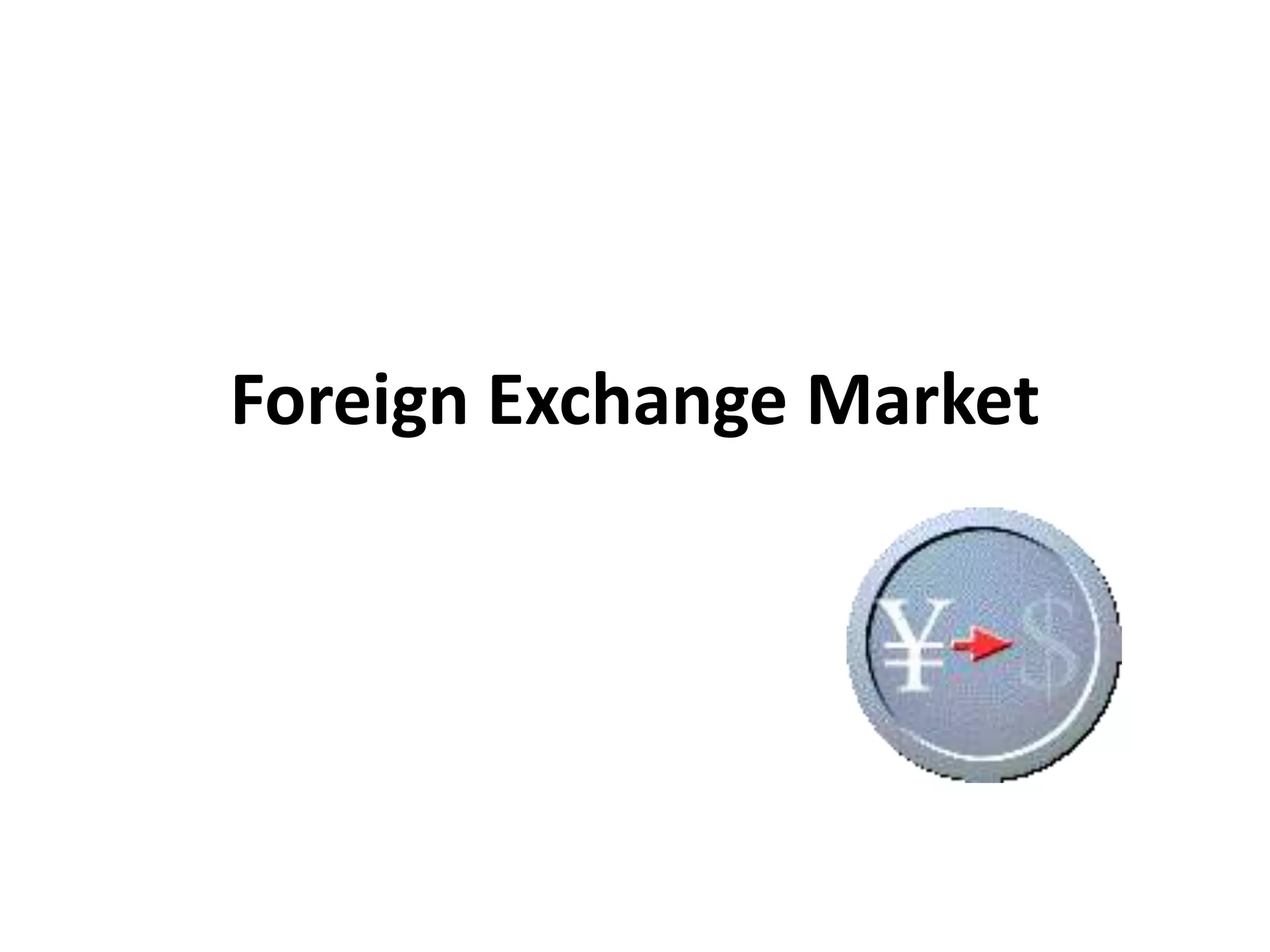 The foreign exchange market allows individuals, banks, and firms to buy and sell currencies. It operates globally through telecommunications and includes spot, forward, futures, swap, and options contracts. Major participants include commercial banks, central banks, brokers, importers/exporters, speculators, and hedgers. The market facilitates international trade and investment by enabling currency exchange.