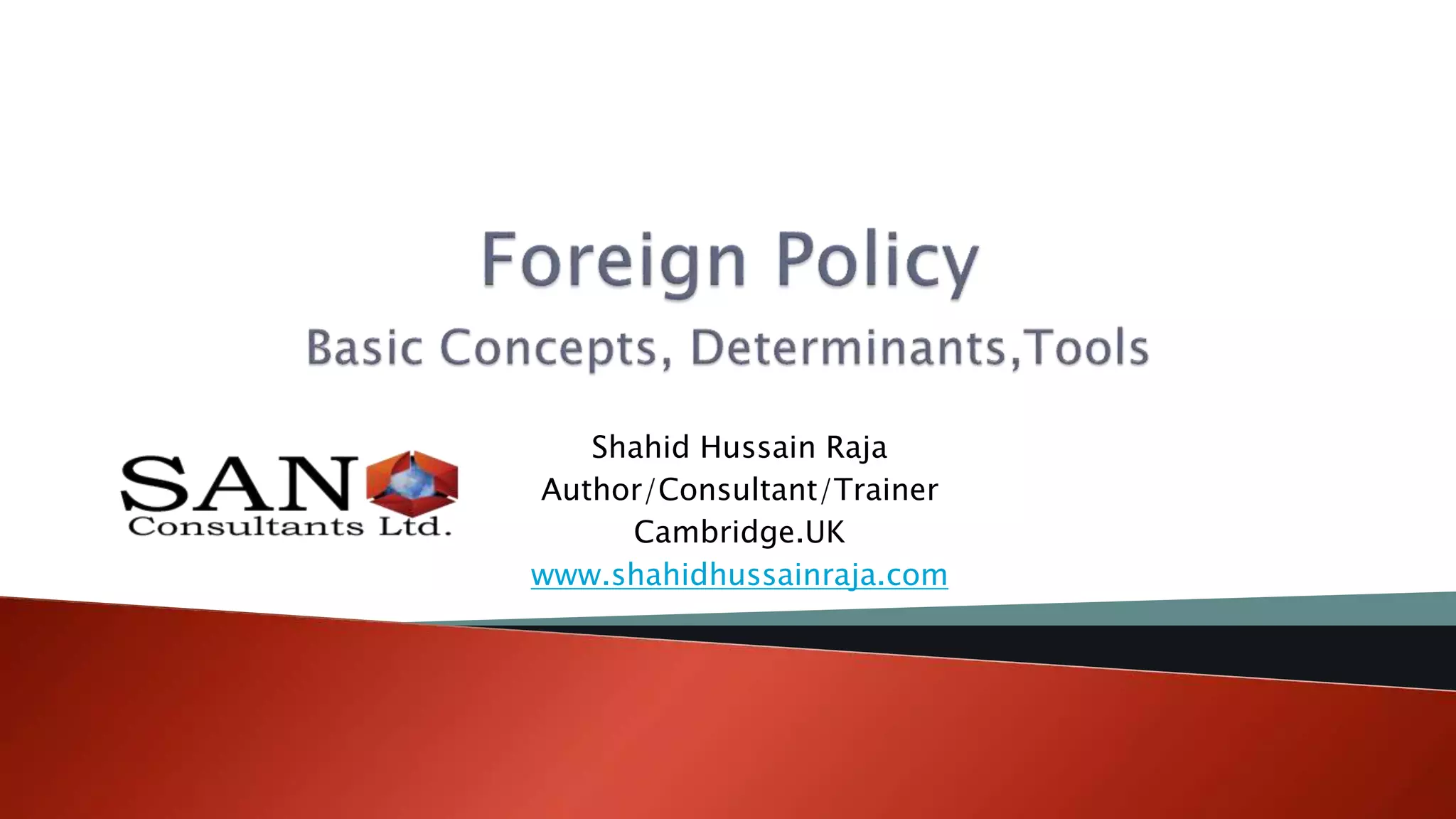 The document provides a comprehensive overview of foreign policy, including its formulation, determinants, and essential components like national interest and strategic culture. It emphasizes the dynamic and interdependent nature of these elements, asserting the significance of a state's foreign relations in improving citizens' quality of life. Additionally, it discusses various tools and conditions necessary for successful foreign policy, along with the impact of geographic, historical, and societal factors.