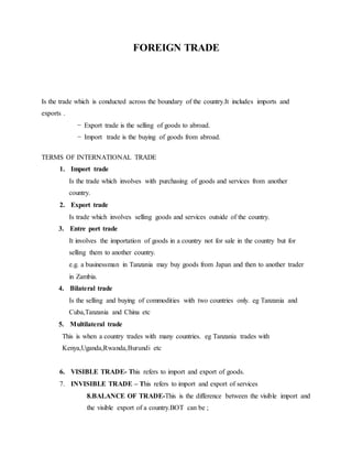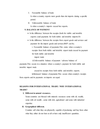 2. It outlines several terms of international trade such as bilateral, multilateral, entrepot, visible and invisible trade.
