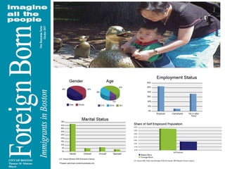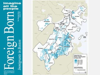 3) In 2007, 28% of Boston's population was foreign-born, totaling over 168,000 immigrants from over 100 countries worldwide. The largest groups come from the Americas, Asia, Europe, and Africa.