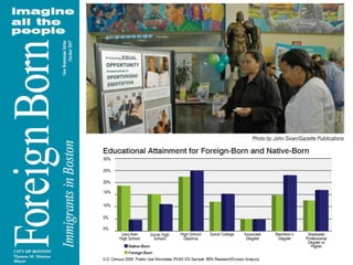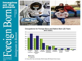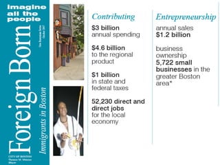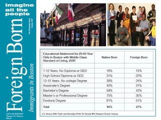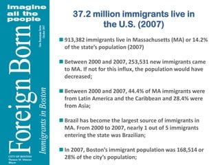 1) Over 913,000 immigrants live in Massachusetts, making up 14.2% of the state's population. Without immigration, the state's population would have declined between 2000 and 2007.
