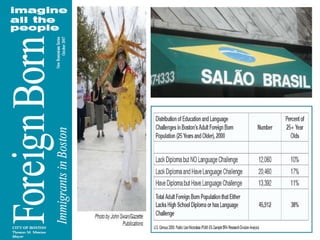 2) The largest groups of immigrants in MA come from Latin America (44.4%) and Asia (28.4%), with Brazil being the top source country.